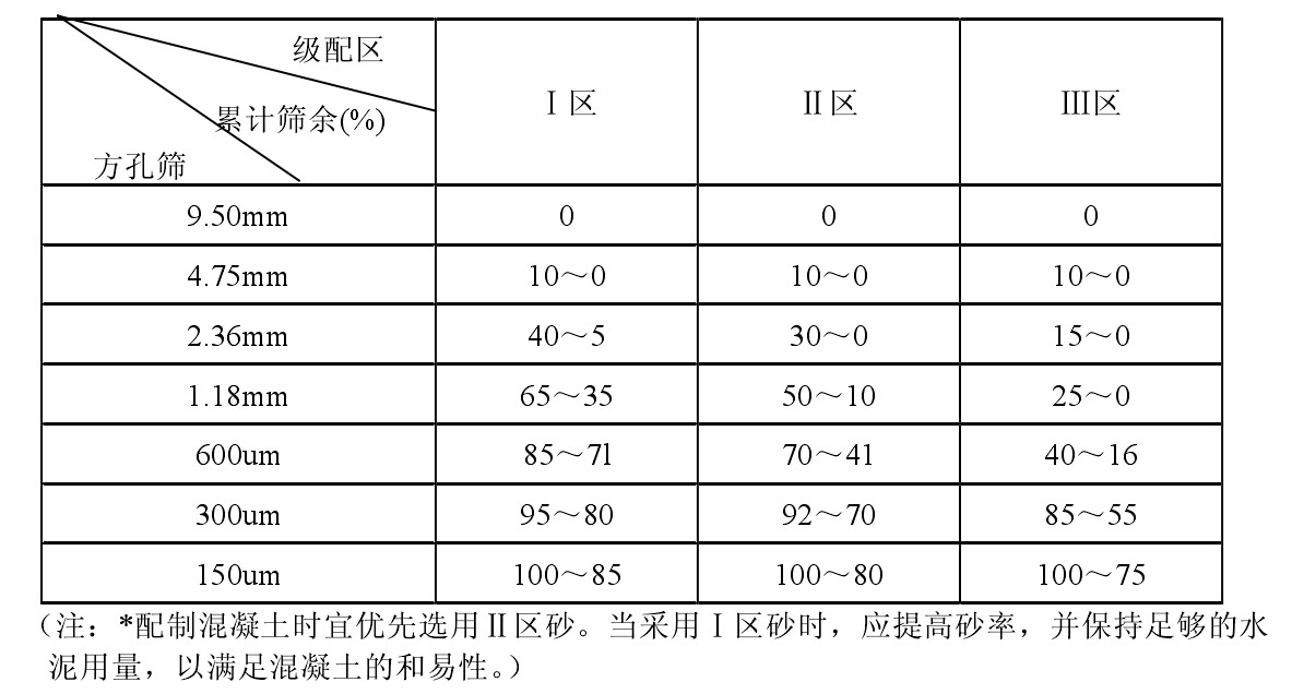 (4)顆粒級配:人工砂按600um篩孔的累計篩余量(以質(zhì)量百分率計,下同)分成三個級配區(qū),其顆粒級配應處于表中的任何一個區(qū)以內(nèi)。機制砂的實際顆粒級配與表中所列數(shù)字相比,除4.75mm、600um篩檔外,可以略有超出,但超出總量應不大于5%。