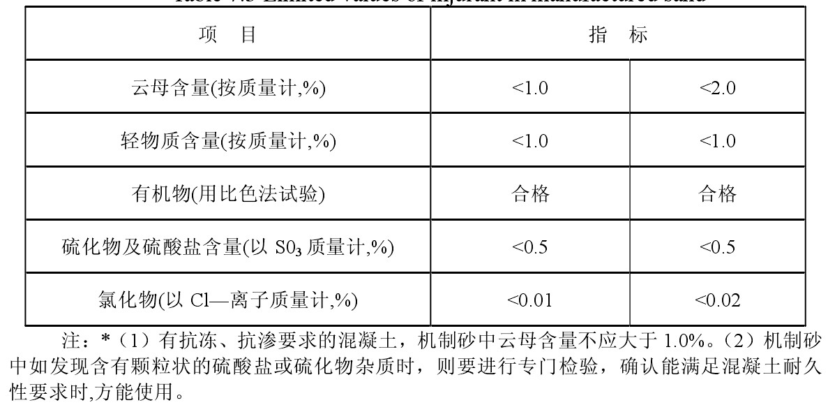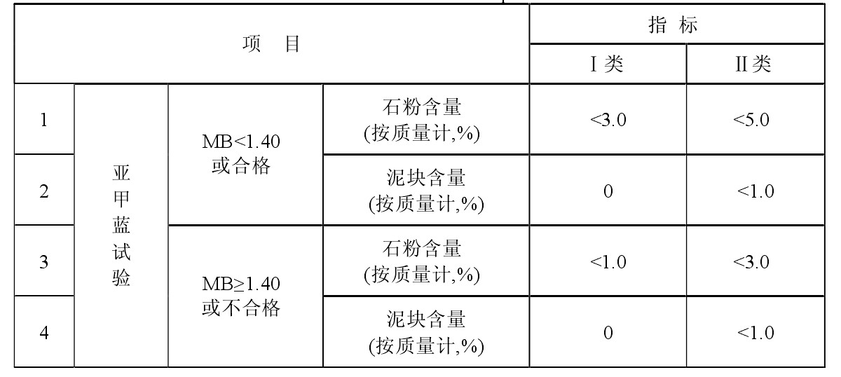 人工砂中的石粉含量和泥塊含量首先應符合下表的規(guī)定。在一定情況下可以將Ⅱ類的石粉含量放寬到7%左右。